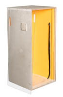 Tynnyrijääkaapin kylkiin tulee kuljetuksessa helposti lommoja ja jälkiä mistä johtuen olemme rakentaneet kuvan mukaisen pehmustetun kuljetuslaatikon missä on läpinäkyvä etulevy ja nauhakiinnitys jääkaapille.